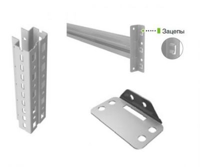 - Крепление балки к стойкам безболтовое. Балка крепится к стойке на зацепах и закрепляется фиксатором, предохраняющим балку от случайного подъема. Балки могут переставляться по высоте с шагом 50 мм.