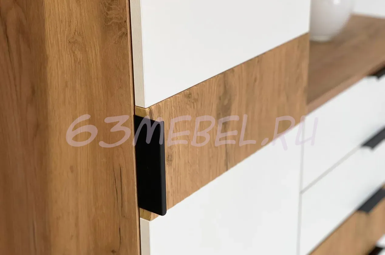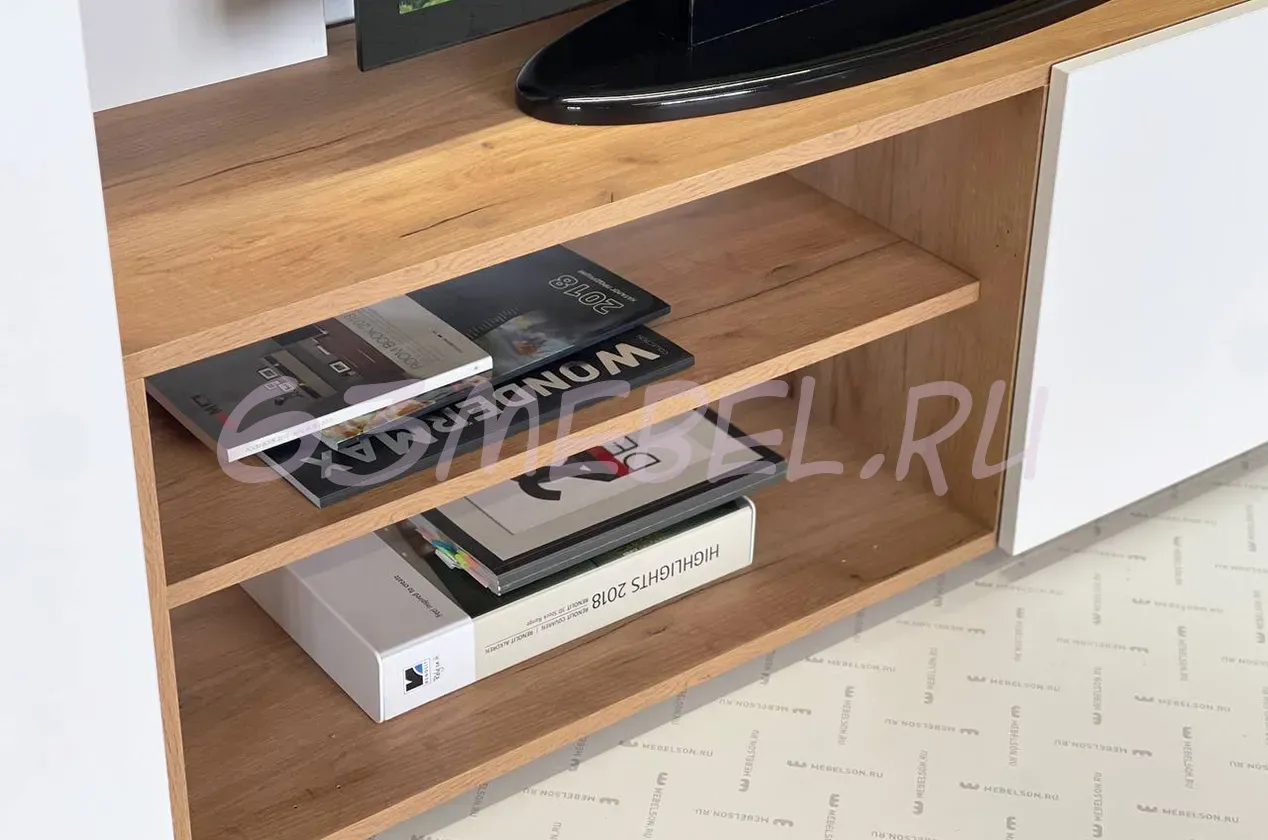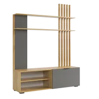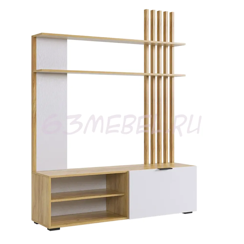 Состоит из: тумбы с открытыми и закрытыми секциями и полками над ТВ зоной.