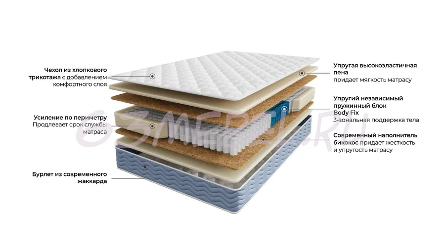 Наполнение: Высокоэластичная пена, Би-кокос, Пружинный блок Body fix, ППУ короб