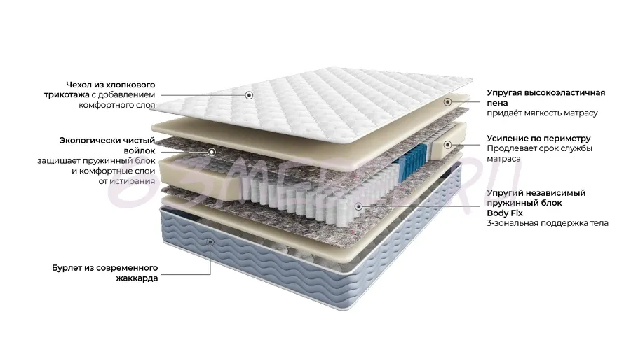 Наполнение: Высокоэластичная пена, Войлок, Пружинный блок Body fix, ППУ короб