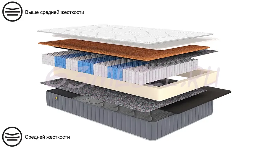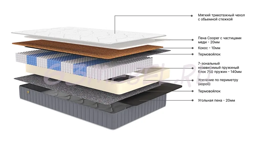 Наполнение: Пена Cooper с частицами меди 20 мм, Кокос 10 мм, Термовойлок, Пружинный блок, ППУ короб, Угольная пена 20 мм