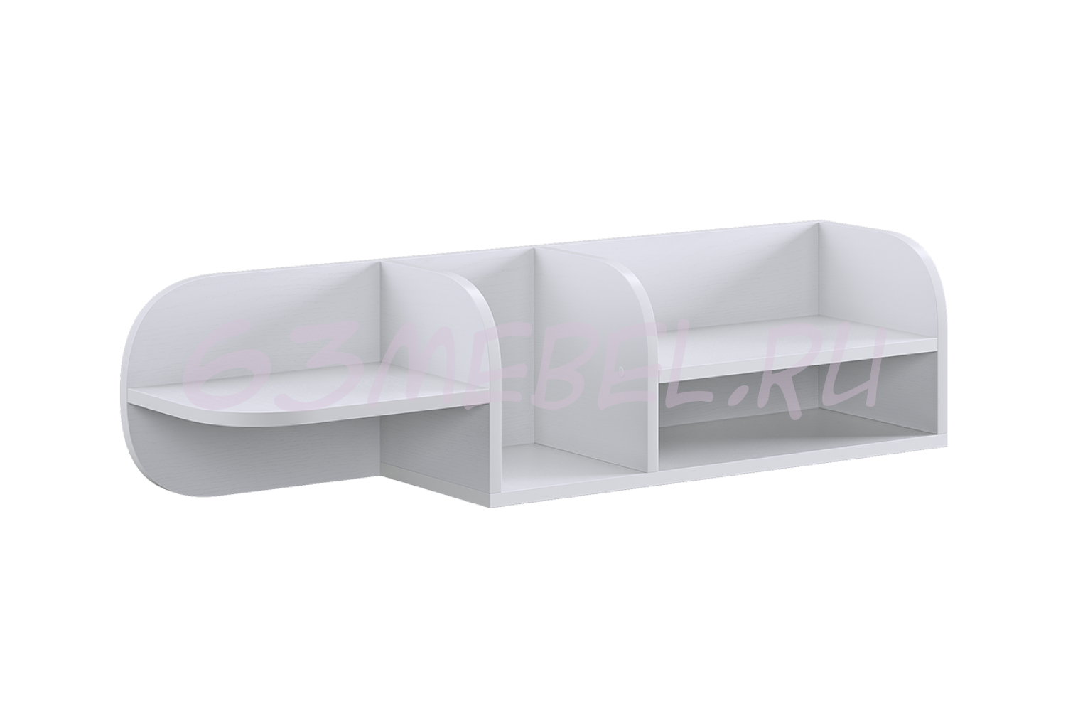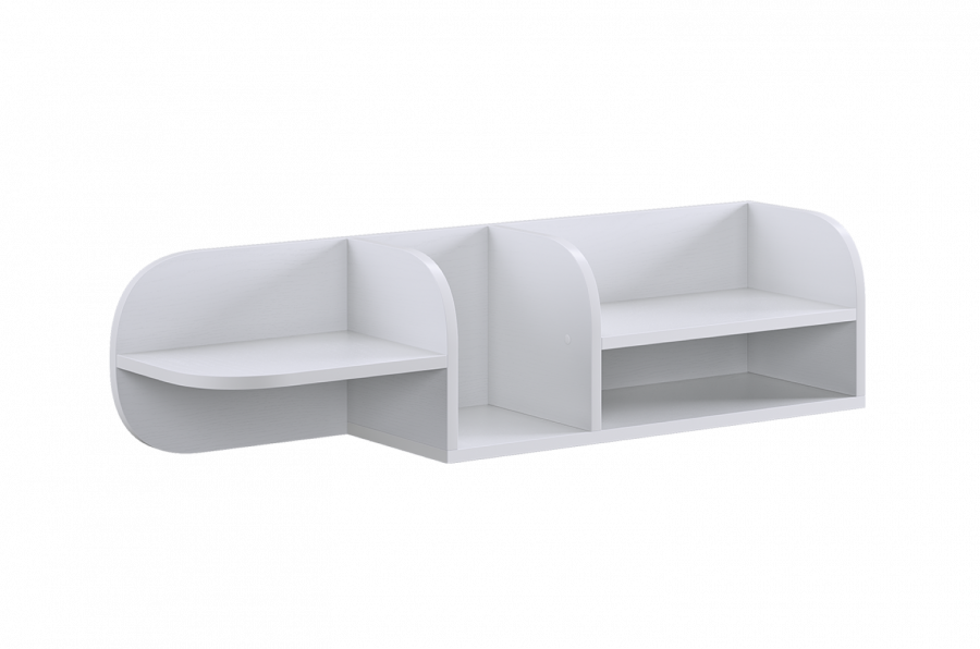 Полка состоит из прочного ЛДСП и имеет две открытые секции, которые удобно использовать для книг, игрушек, декора или учебных принадлежностей. Закруглённые боковые элементы придают конструкции мягкий, безопасный внешний вид, что особенно важно для детской комнаты.