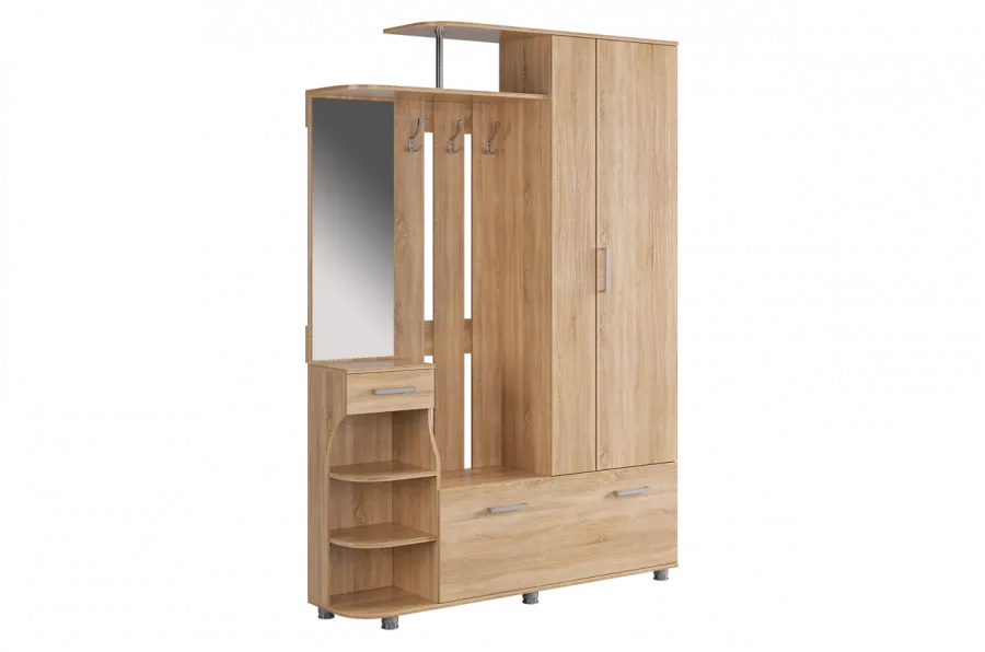 Прихожая Барселона-2 воплощает в себе открытую вешалку с крючками для теплой верхней одежды, закрытый шкаф, удобную обувницу и специализированное место для головных уборов. К тому же, модель укомплектована панелью с зеркалом, ящиком и полками для различных мелочей, которые должны быть всегда под рукой. Удобство использования дополняется регулируемыми по высоте ножками.