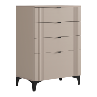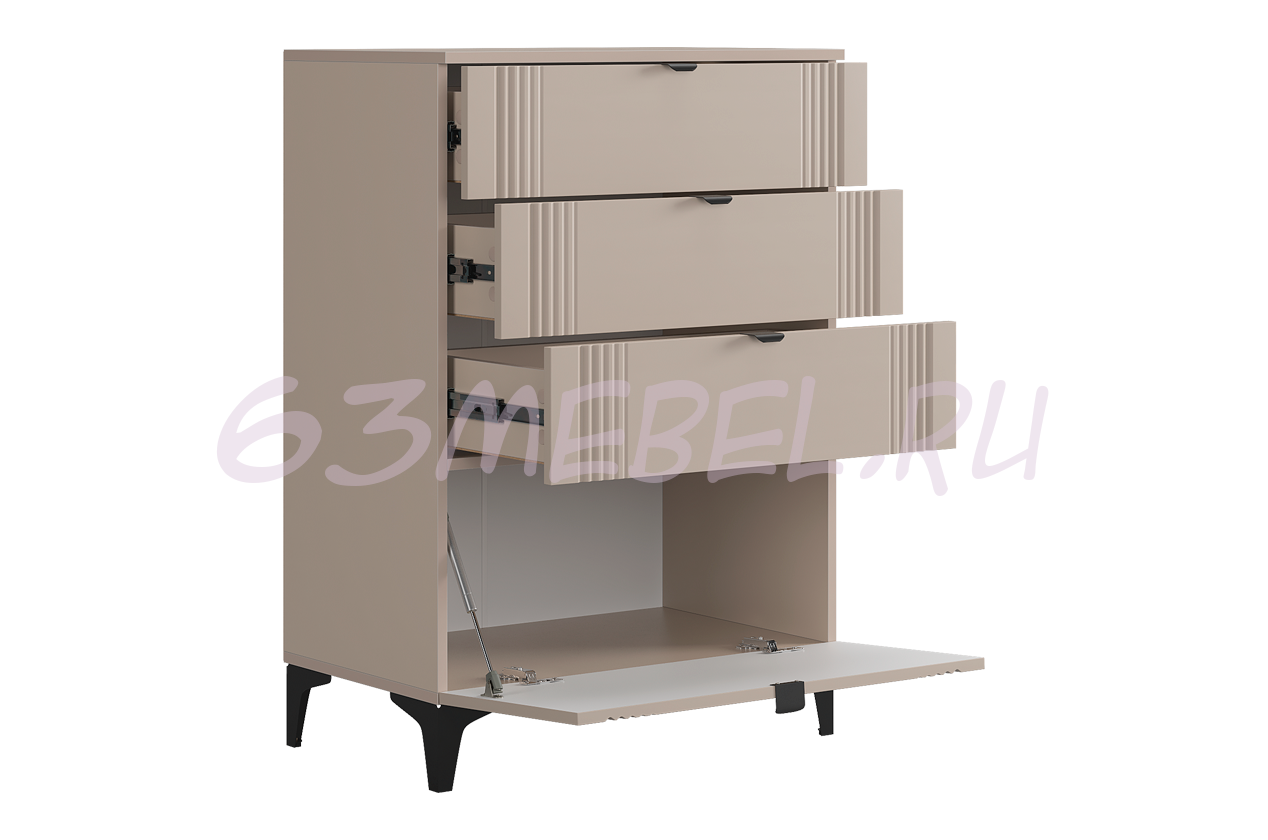 Комод изготовлен из качественных материалов: корпус выполнен из ЛДСП, что гарантирует прочность и долговечность, а фасад, выполненный из МДФ в плёнке ПВХ, не только выглядит эстетично, но и защищает комод от повреждений. Особое внимание заслуживает фрезеровка фасадов, которая придаёт изделию изысканный вид.