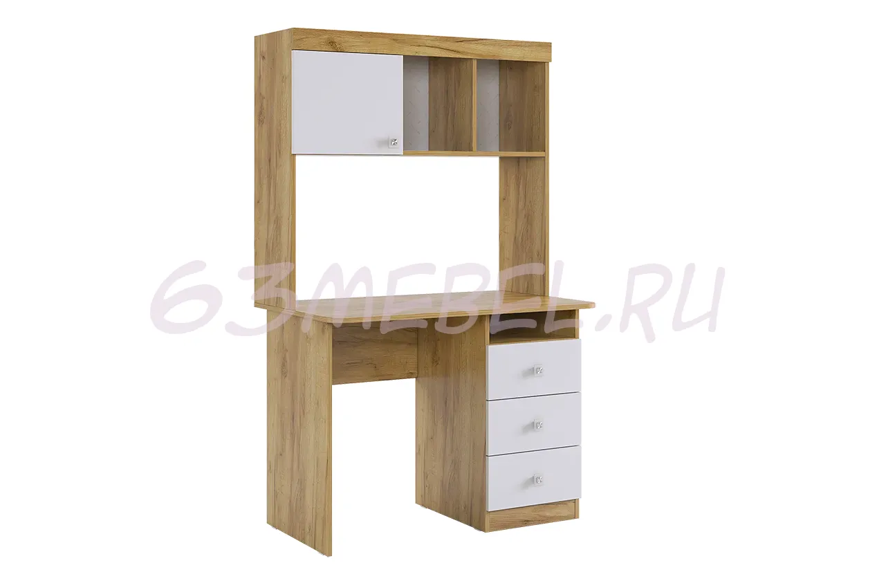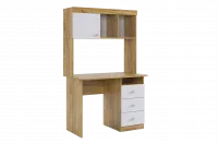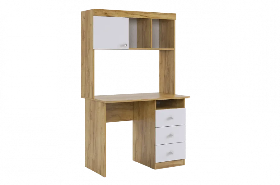 Состоит из: столешницы, 3-х выдвижных ящиков и полки для книг с закрытой нишей и открытыми  полками.