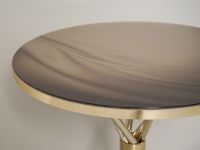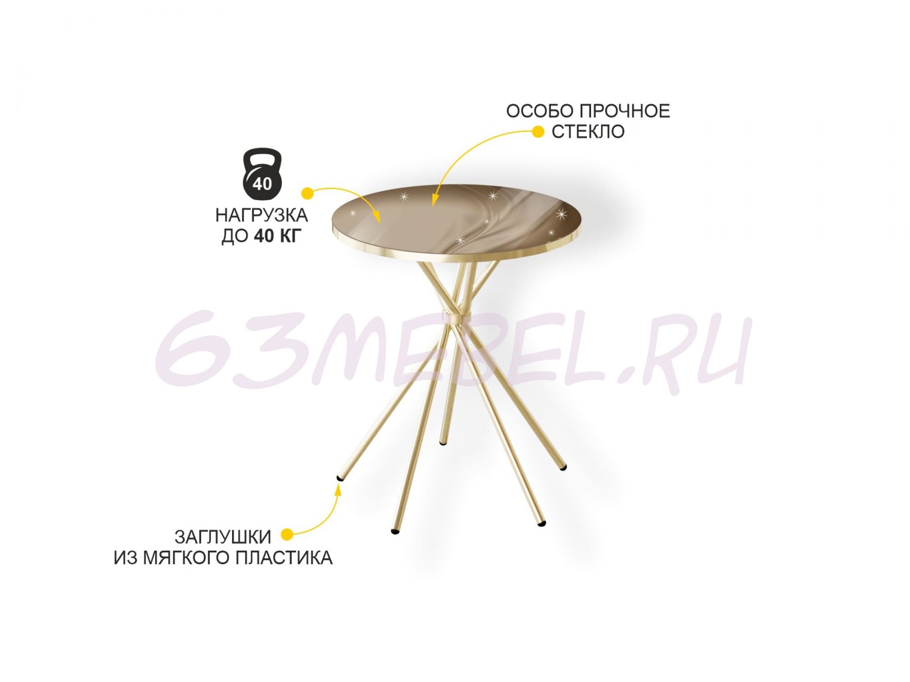 Столик выполнен в современном стиле, который удачно сочетает в себе элегантность и практичность. Круглая форма столешницы делает мебель удобной и комфортной в использовании. Сочетание дизайнерского рисунка с нежной россыпью глиттера и «золота» добавляет интерьеру элегантности.