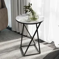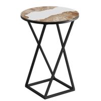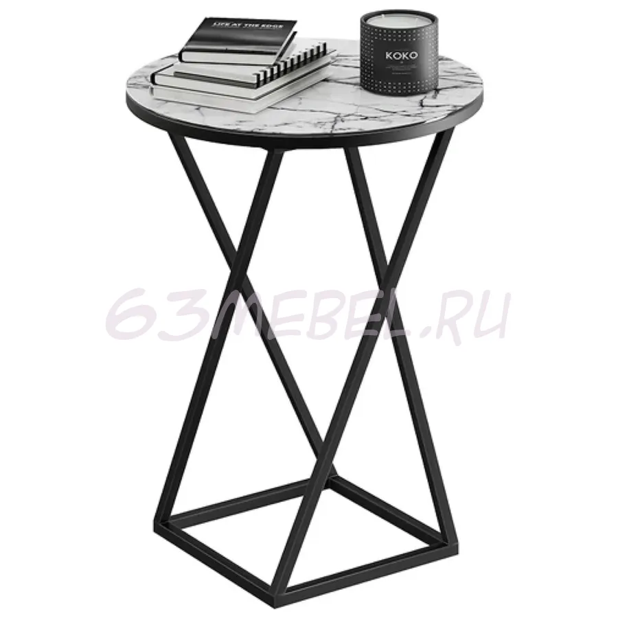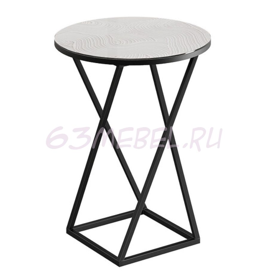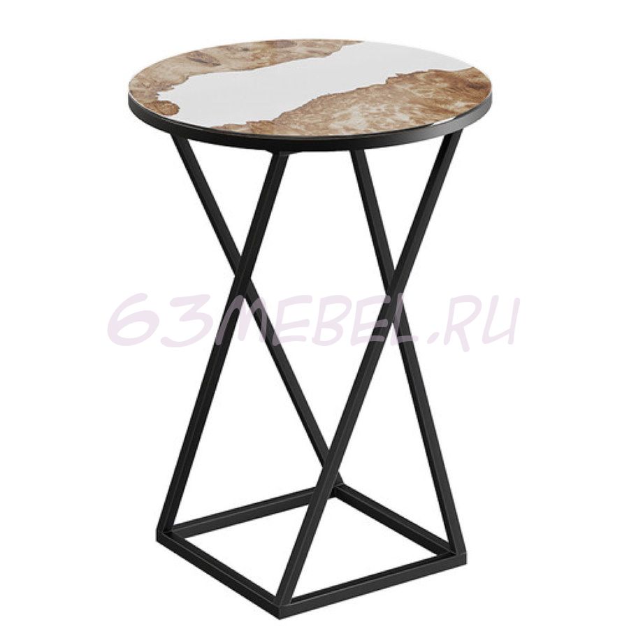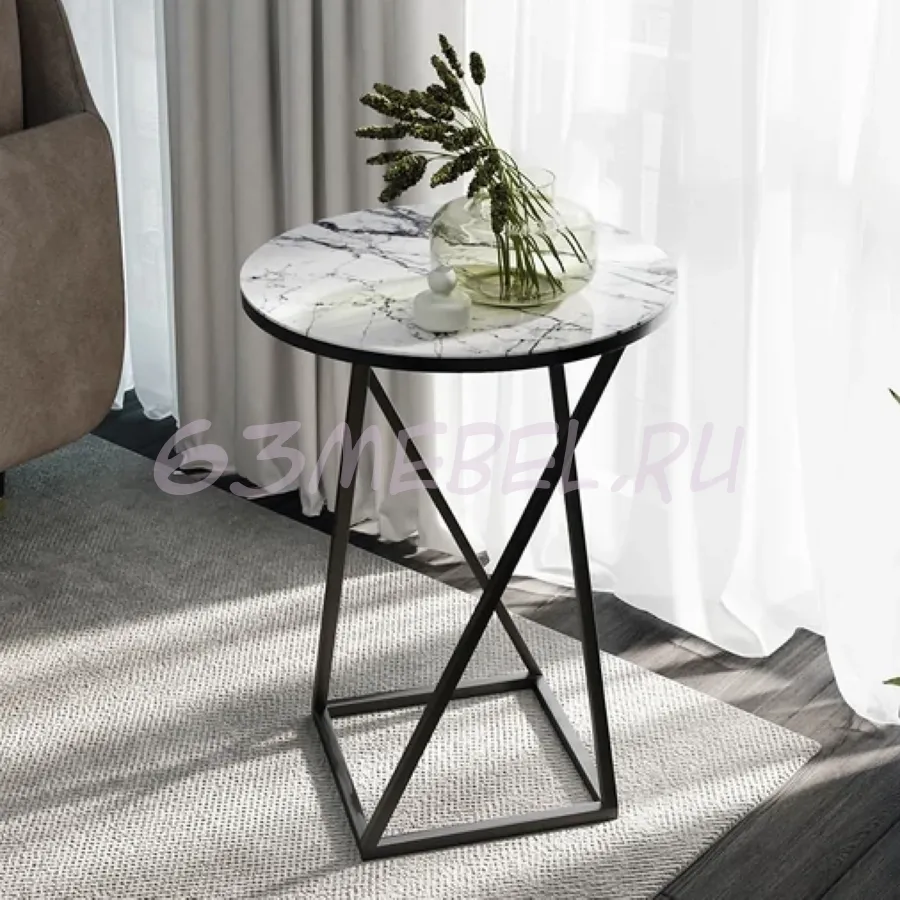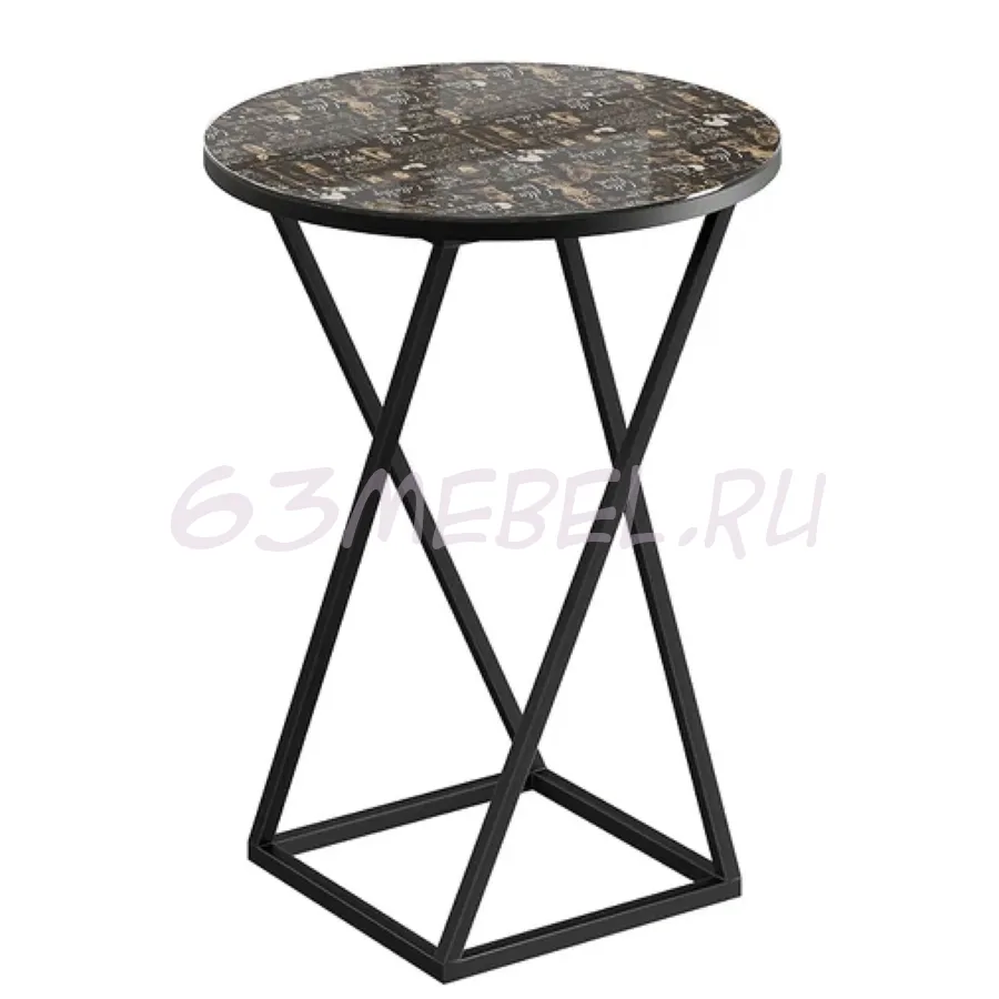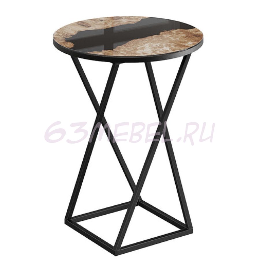 Декор.  Стеклянная поверхность покрыта фотопечатью, имитирующей мрамор, утончённость и лоск которого дает возможность создать действительно изысканный дизайн. Столешница установлена на декоративную черную металлическую опору. Сочетание стекла и металла выглядит великолепно и легко вписывается в интерьер любого помещения.